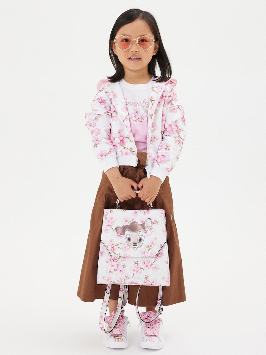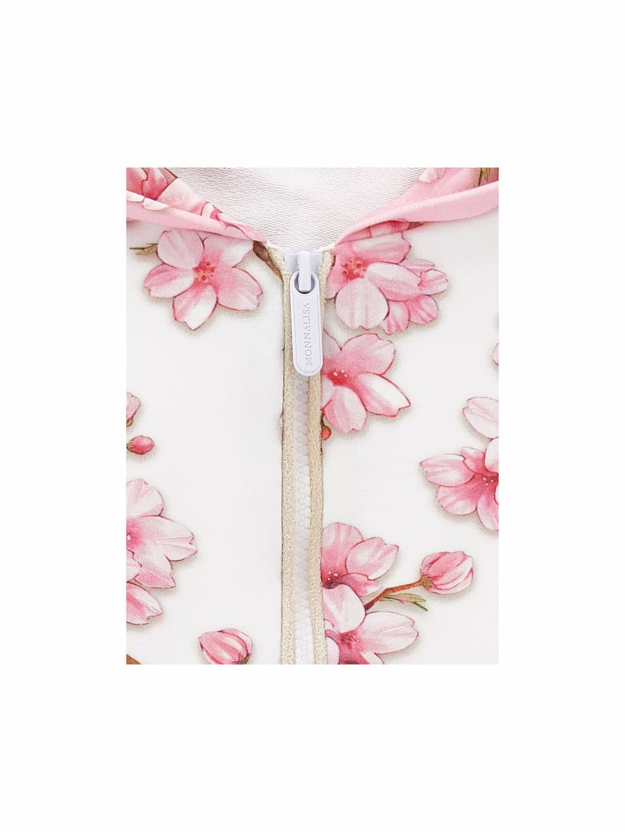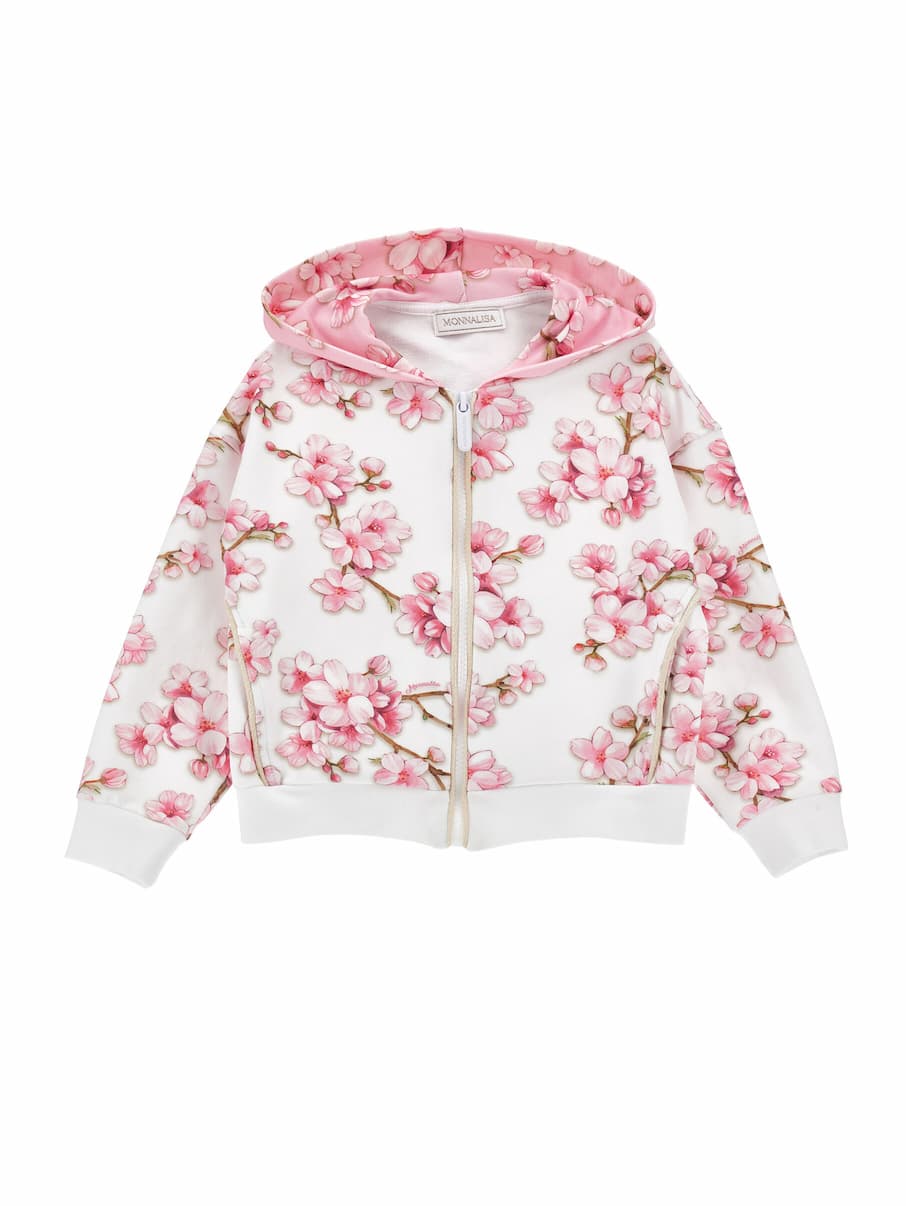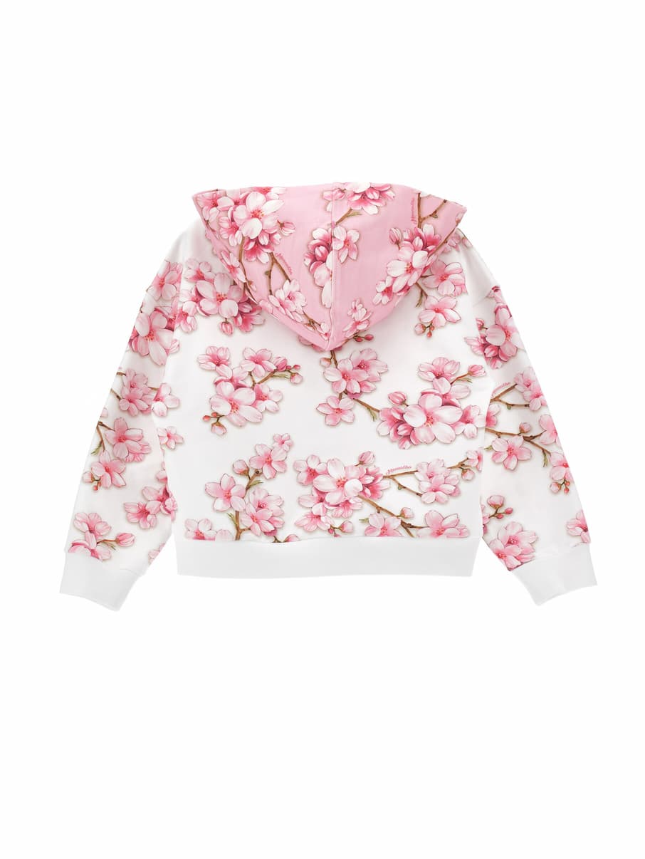 Una stampa romantica e bicolor per la felpa da bambina con cappuccio, ispirata ai fiori di pesco